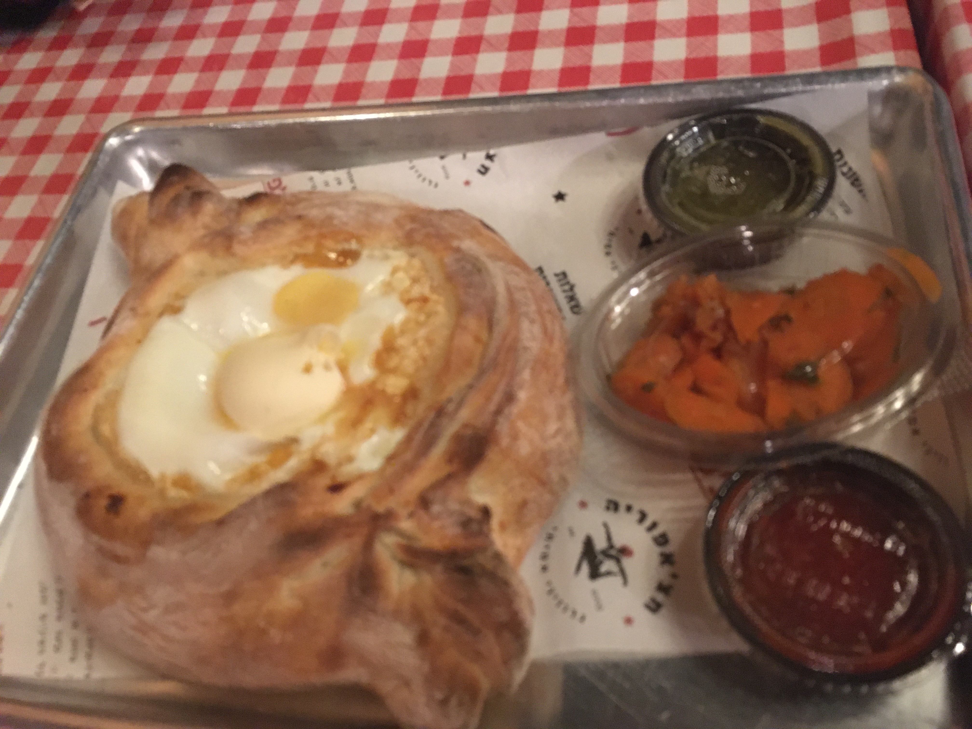 The restaurant we went to only served one dish, but they served it in multiple ways. The dish is called Acharuli. Acharuli is a bread basket filled with cheese, butter, and an egg. The egg is not fully cooked when you get the dish, so you mix it all together and the heat from the other ingredients cooks the egg.