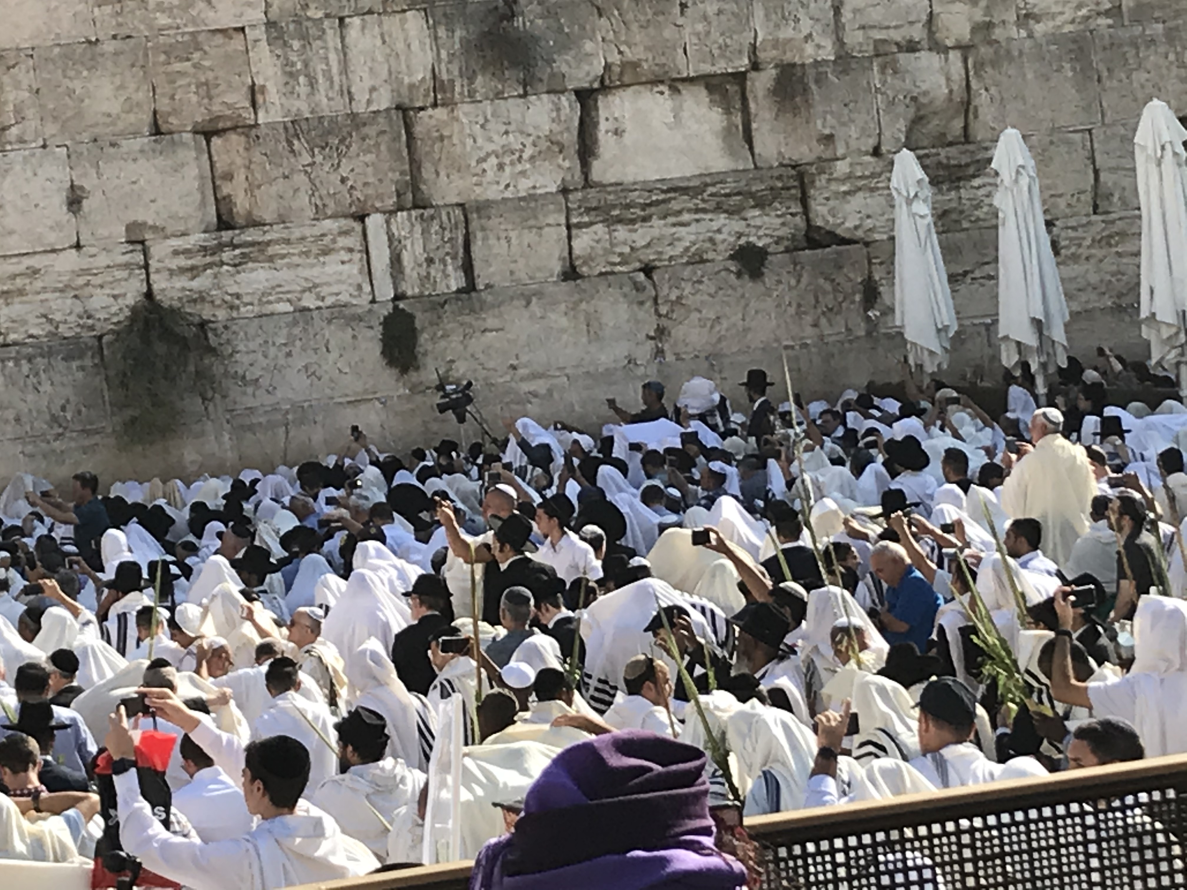 Twice a year, on Sukkot and pesach, there is a giant priestly blessing (birchat cohenim) at the kotel. I’ve seen pictures of the crowds and large number of cohenim under their tallitot blessing people, and as part of my attempts to fit as much as possible into this year, I headed to the kotel early this morning. Definitely impressive number of folks there with no free inch throughout the kotel plaza. Nothing like a huge amount of pushing and jostling by others trying to move forward and the selfie posing and talking on the phone to kill any chance at religious inspiration. I did bring my lulav to the kotel (and used it) and had my tallit wrapped around my neck as a scarf and no one said anything to me and did see a few other women waving lulavs.
