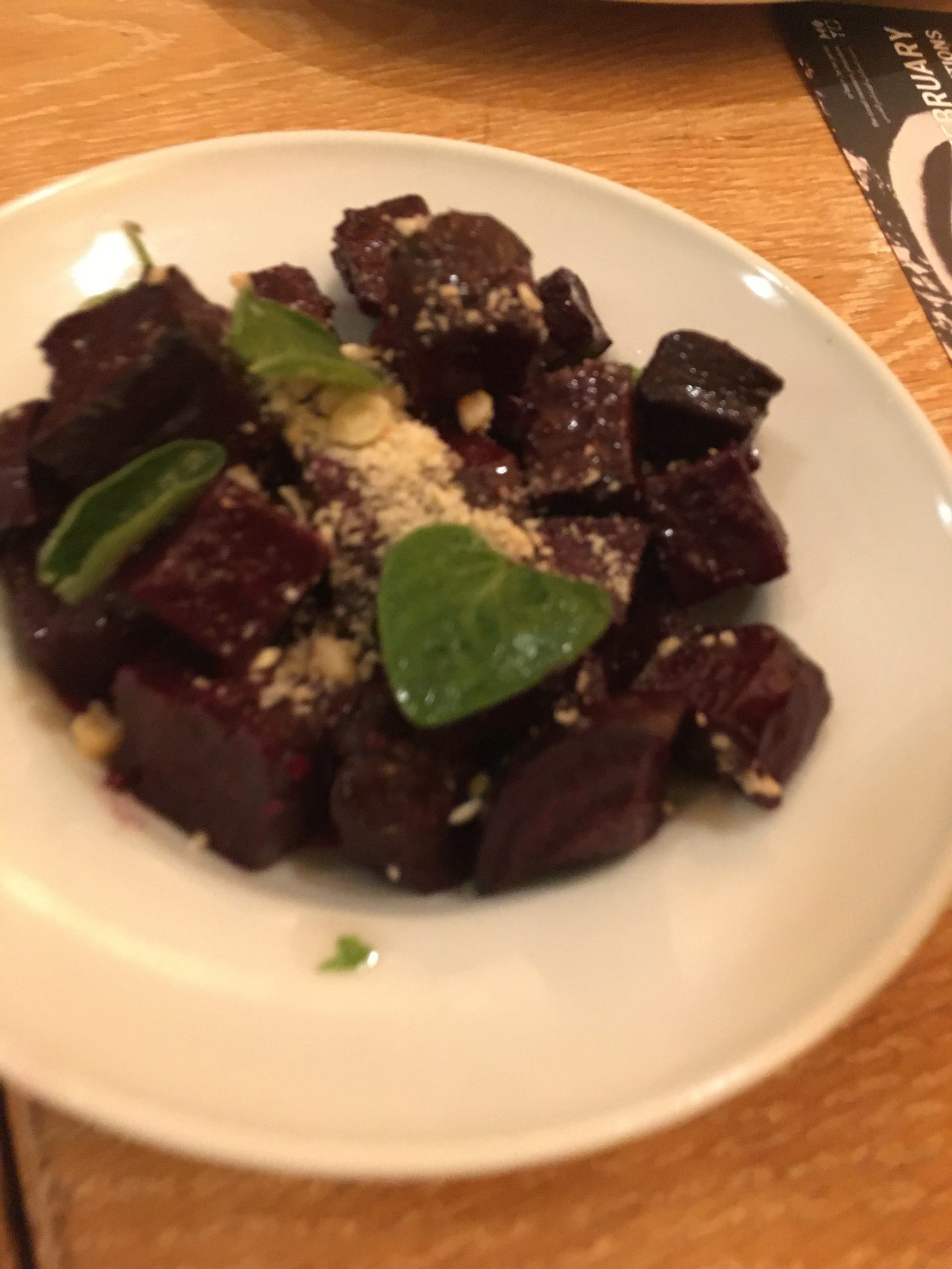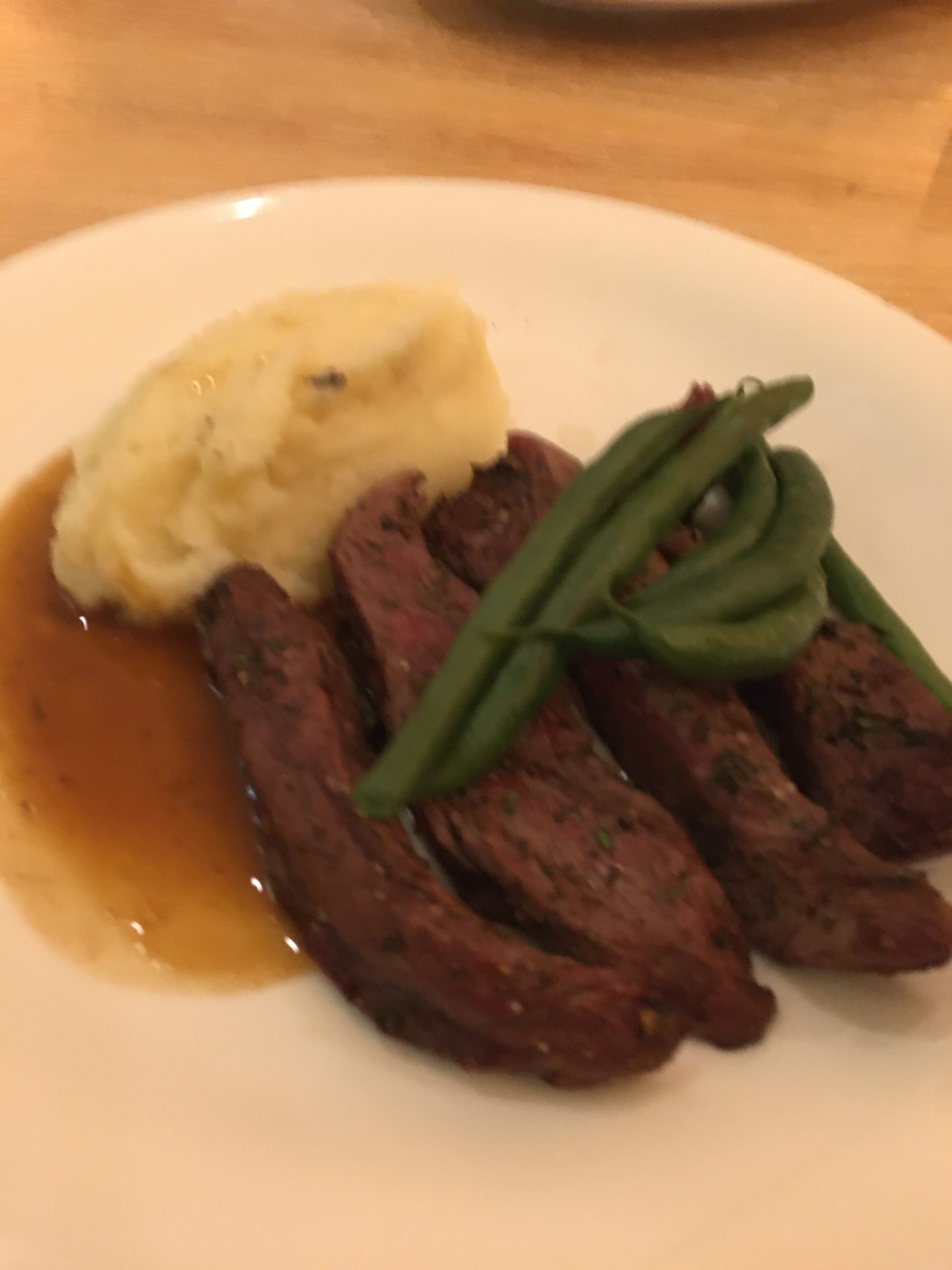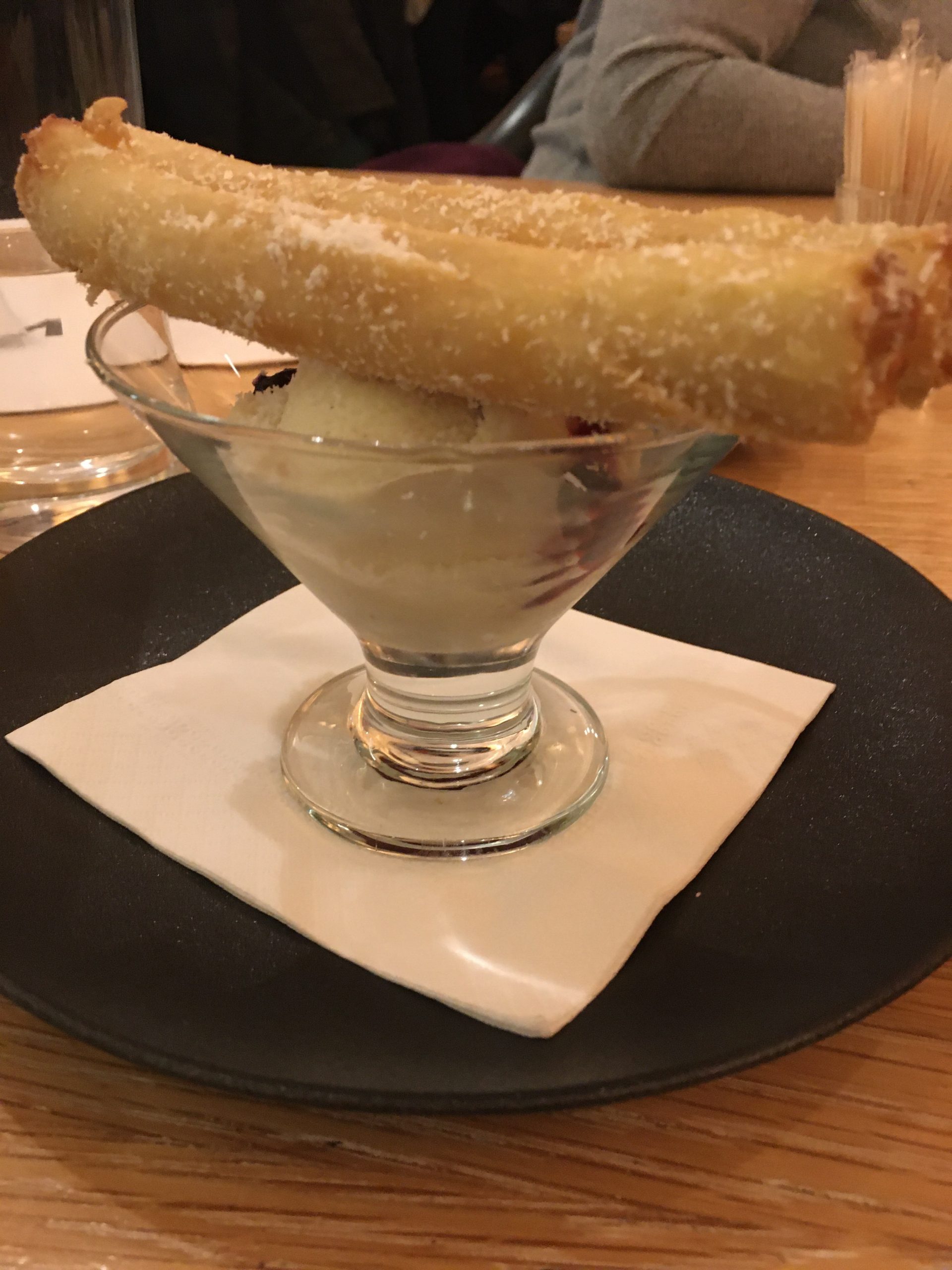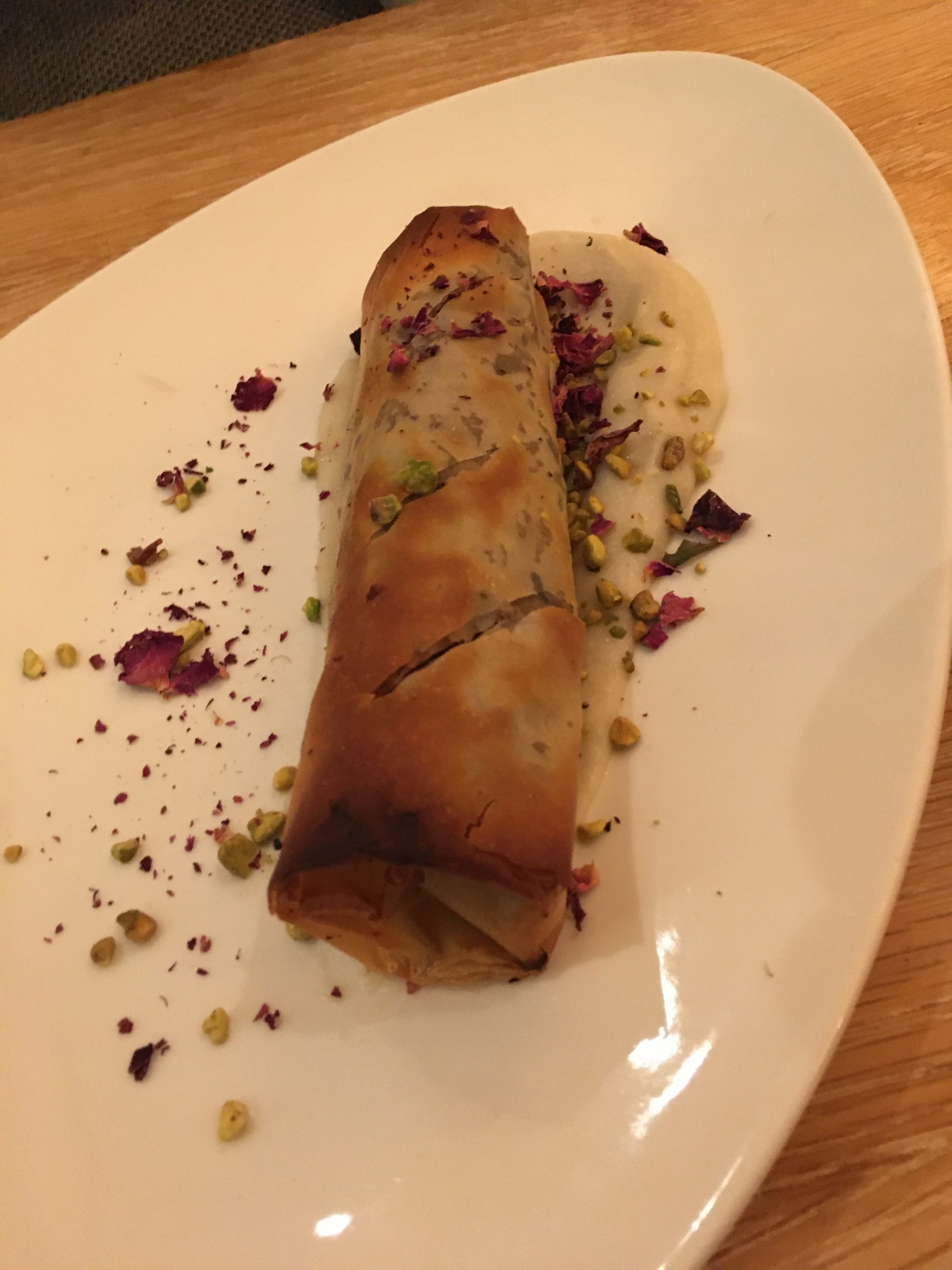 I ate steak, Naomi had sashimi, and Ima got ground beef in filo dough. We also got a side of beets and for desert almond cigars with parve ice cream and a chocolate mouse with peanut butter also with parve ice cream. All the food was really tasty, especially the almond cigars with ice cream. I would definitely go back for those cigars.