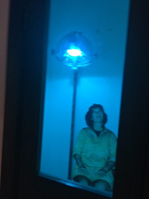 The tanning room where a cardboard person is currently getting a tan