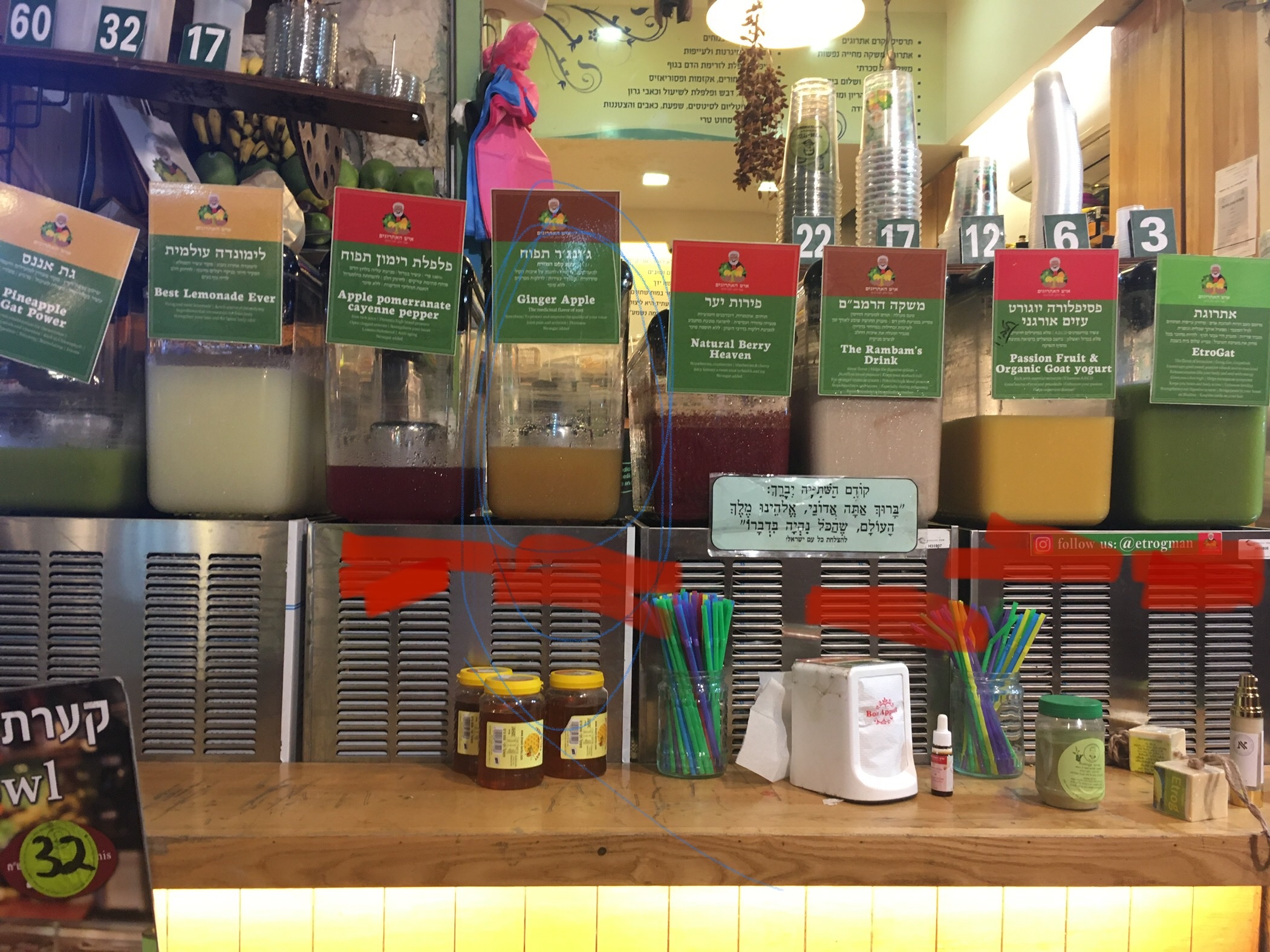 We tried 5 out of the 8 juices. We tried apple pomegranate cayenne pepper, ginger apple, the Rambam’s drink, passion fruit and organic goat yogurt, and EtroGat.